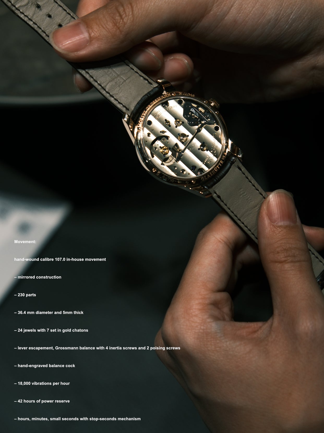 The construction of the entire calibre 107.0 is mirrored, to explain it in the most simple way, and is essentially a calibre 100.1 in reverse. When you want to flip a movement to display the gear train, escapement and other bits normally only visible through a transparent caseback on the front of the watch, you might encounter a few issues. The most important one is the rotational direction of all the wheels. If not corrected, it would result in the hands running counter-clockwise. Moritz Grossmann reworked the calibre 100.1 to reroute the rotational direction so it will run clockwise again. An extra wheel is positioned between the crown wheel and ratchet wheel. Other than that, the construction of the entire escapement is different too. On one hand, it needed to be reworked to fit with the redesigned 3/4 plate and on the other hand, the escapement and direction of the coiling of the balance spring are mirrored too. The balance cock is hand-decorated with a floral engraving, as is common in all Moritz Grossmann movements.